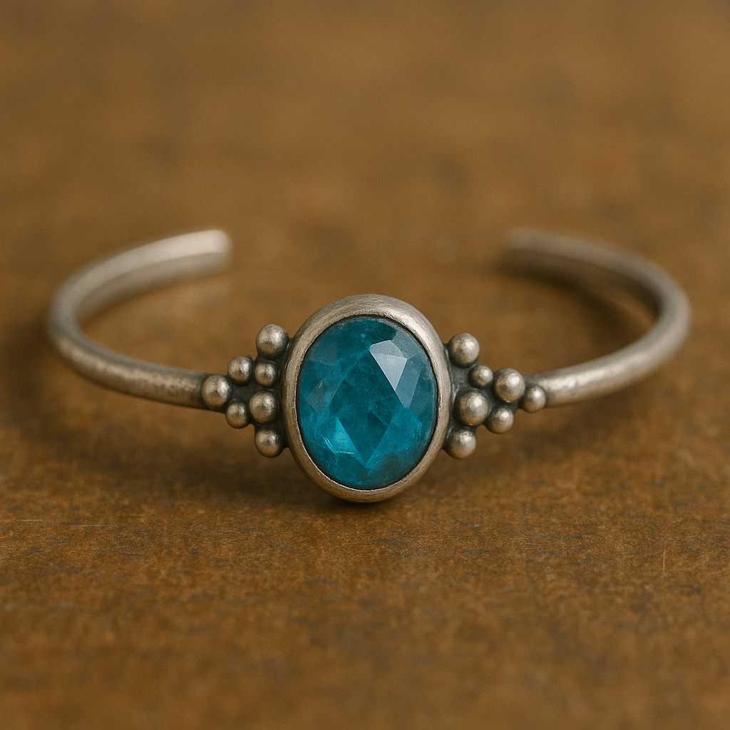 Close-up of gemstone setting and silver raindrop embellishments on handcrafted cuff bracelet with TowedStudio.com